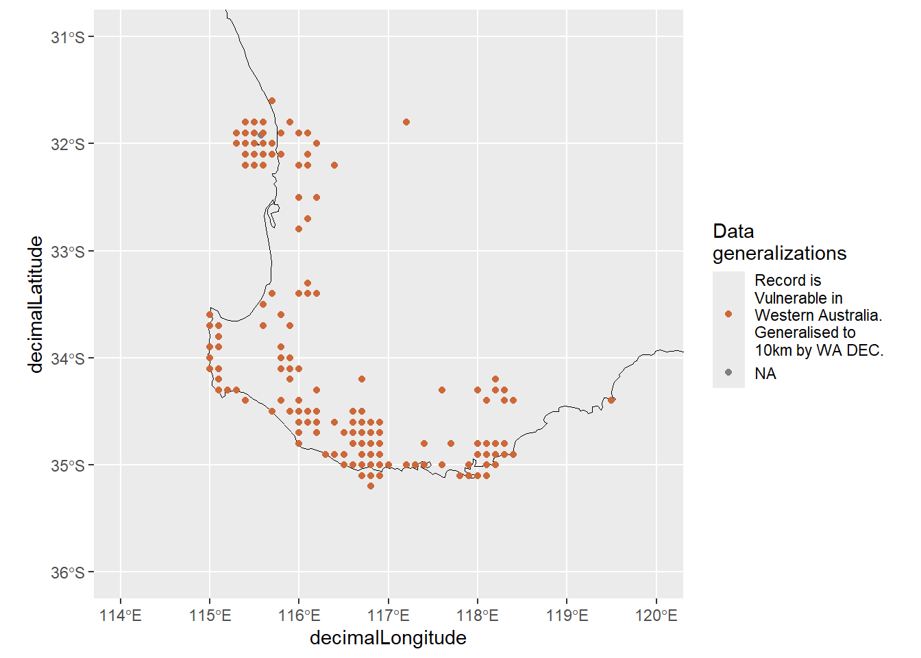 Quokka data offer a nice example of what to look for when data points have been obfuscated. When plotted, obfuscated occurrence data appear as if points were placed onto a grid 3.